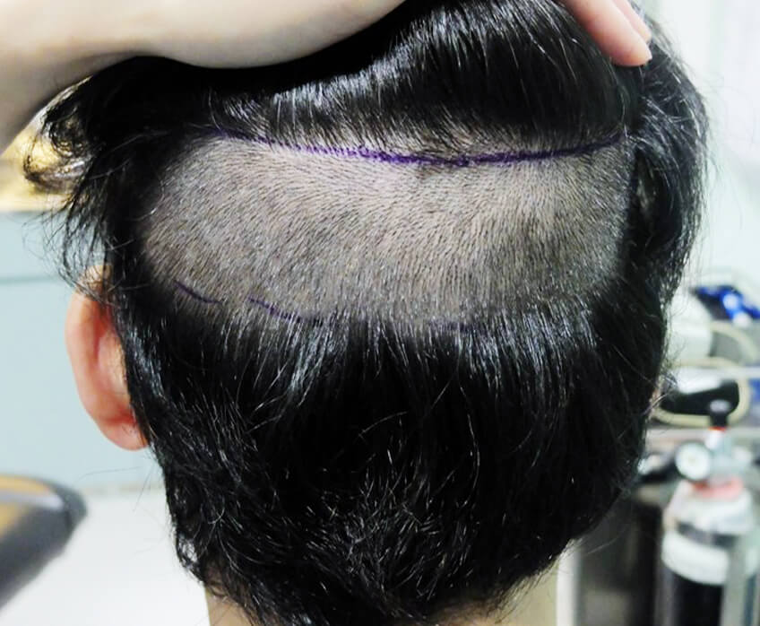 With our skill we are able to cut a 3 or 4-hair follicular unit longitudinally into 2 intact halves. One half is removed for re-implantation as usual, while the other left behind to regrow.